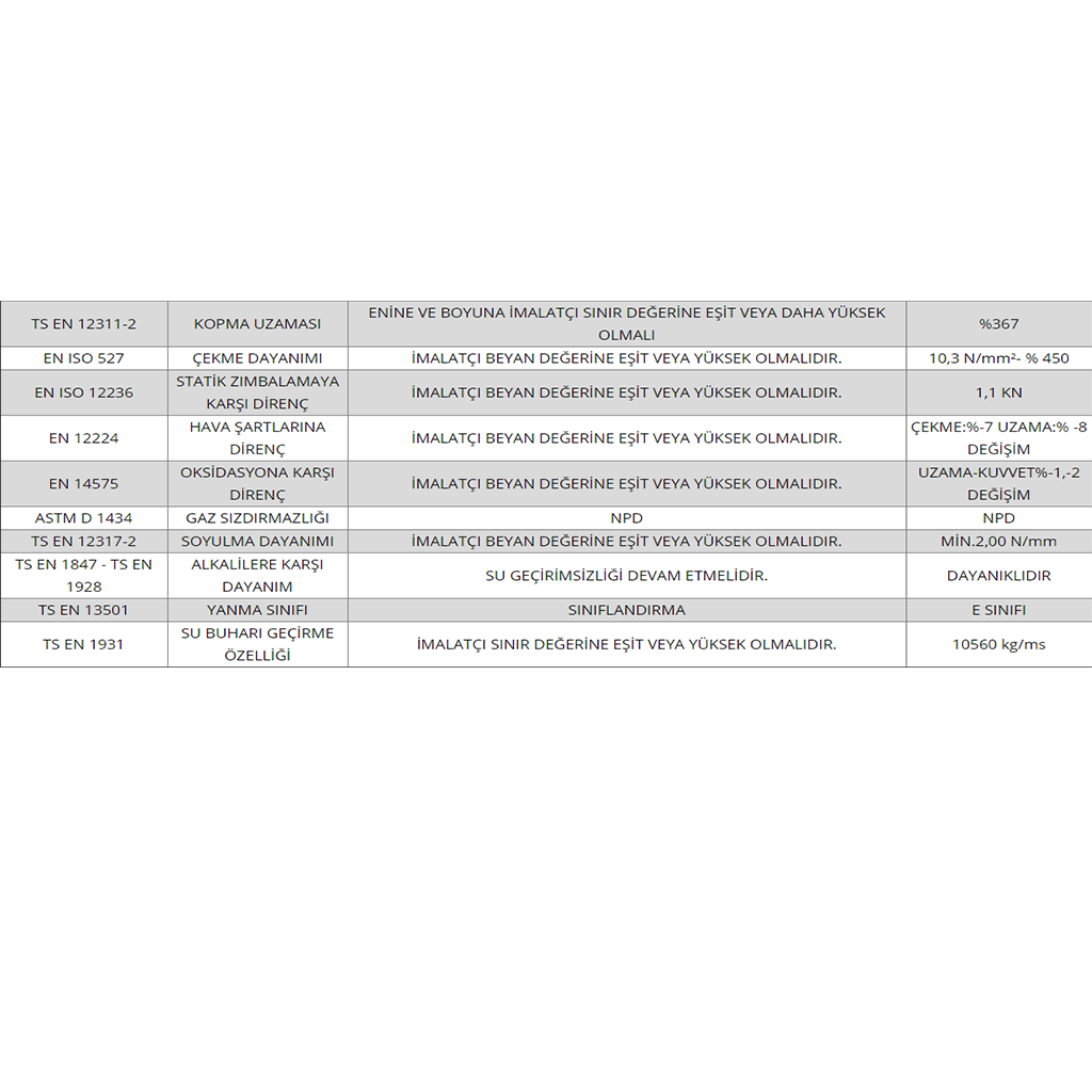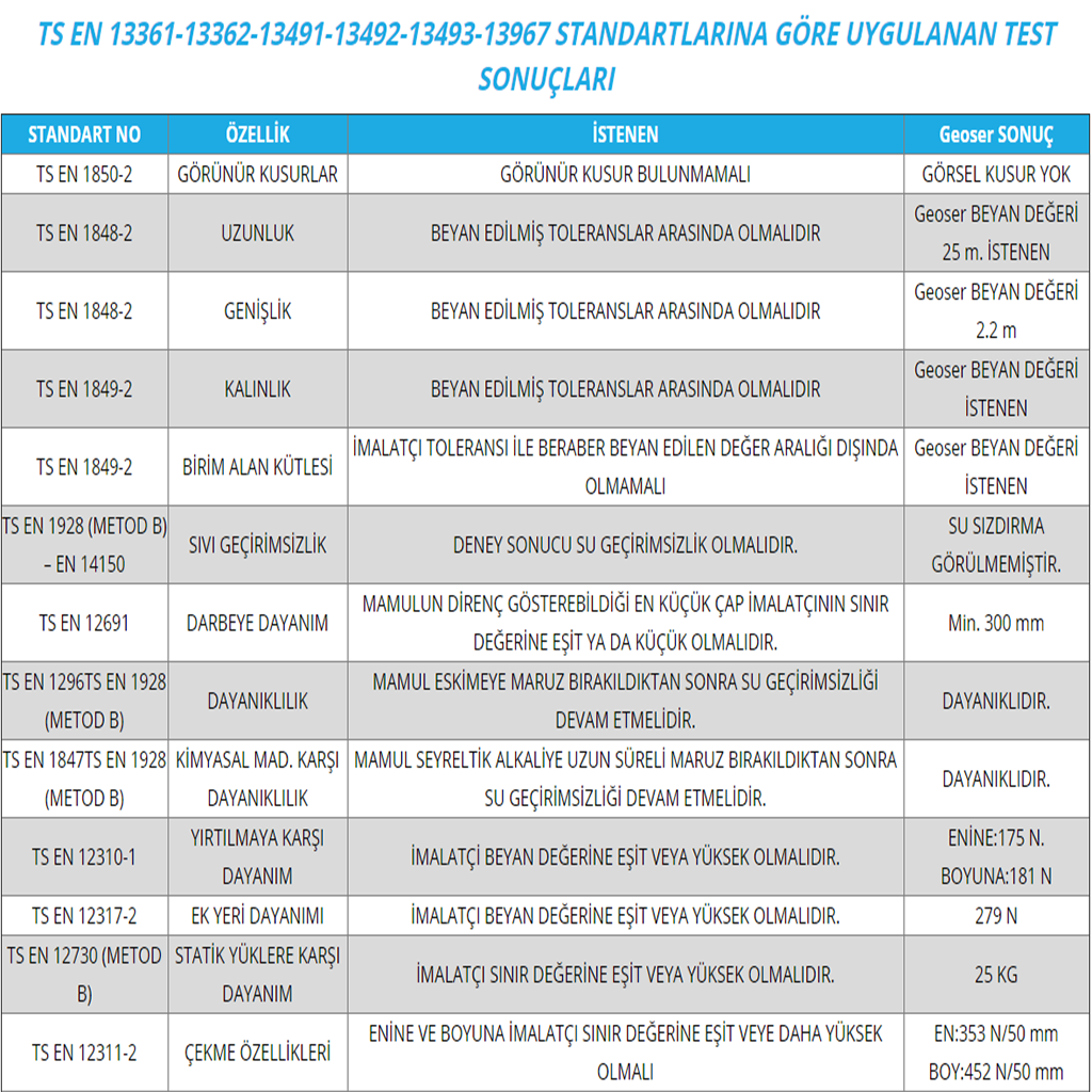 1, 1.2, 1.5, 2.0, 2.5, 3 mm aralığındaki kalınlıklar-da üretilirler. Bina Temellerinde, Teraslarda, Göletlerde, Kanallarda, Rezervuarlarda, Havuzlarda kullanılırlar. UV Dayanımlı olarak talebe göre üretilirler. Ürün genişliği 2,05 m.’dir. Boy serbest olarak istenilen uzunlukta hazırlanabilir.